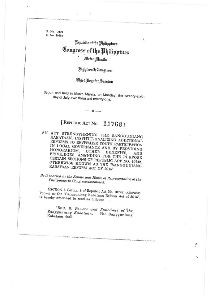 President Rodrigo Duterte has signed Republic Act No. 11768, the law strengthening the Sangguniang Kabataan and providing amendments to certain provisions of the SK Reform Act of 2015.